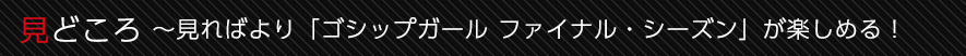 もちろん通算6年目となるファイナル・シーズンでもアディクティブなストーリー展開は健在。そして最大のミステリー、アッパー・イースト・サイドに渦巻くドラマの黒幕で謎の存在“ゴシップガール”の正体が、いよいよ明らかになるときがやってくる!“ゴシップガール”は一体誰? ブレアとチャックの未来は?セリーナが最後に選ぶ男性は?フィナーレにふさわしい極上ゴシップが到着です!