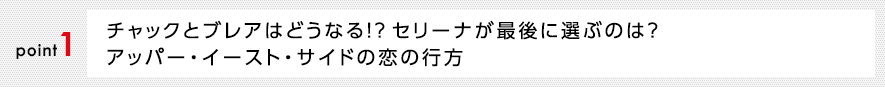 フィナーレを迎える今シーズンでGG ファンが最も注目するのは、セリーナとブレアの恋の行方だろう。これまで紆余曲折ありながら、本人同士も自覚している通り、お互いが生涯の最愛の人であるチャックとブレア。それぞれ一度はお互いをあきらめた二人だが、フィナーレに向けて、この切っても切れない二人の関係はどう進展するのか。