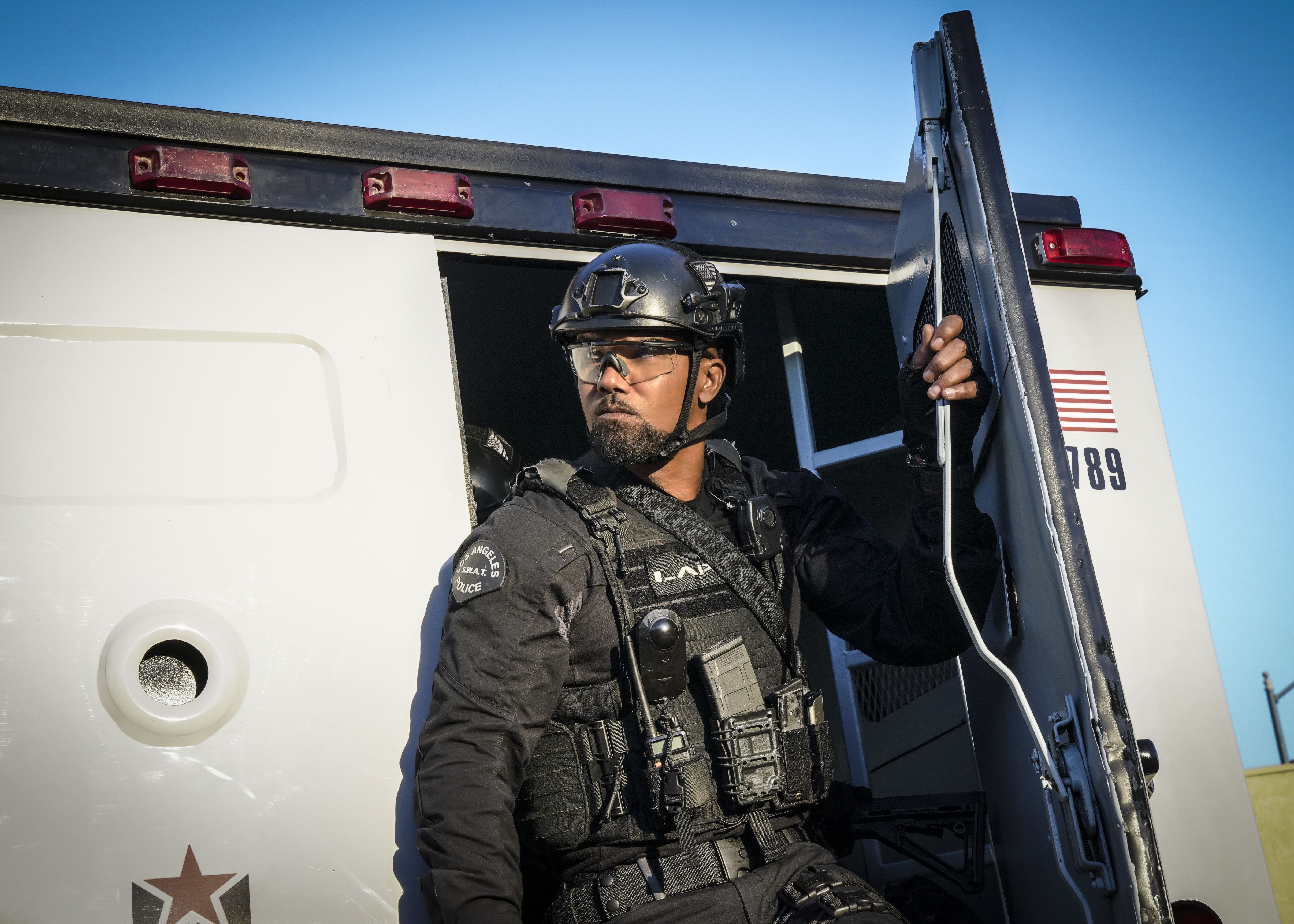 ダニエル・“ホンドー”・ハレルソン役のシェマー・ムーアだ。「S.W.A.T.」の撮影現場にいる。“SWAT”は“特殊武装戦術部隊”の略だ。
