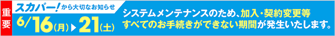 このたび、スカパー!では、お客様情報管理システムの大規模メンテナンスを実施するため、6月16日(月)から6月21日(土)にかけてすべてのお手続きができない期間が発生いたします。