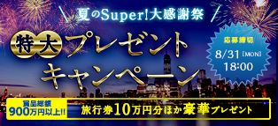 【受付終了】旅行券10万円分ほか、賞品総額900万円以上の豪華賞品が当たる!「夏のSuper!大感謝祭 特大プレゼントキャンペーン」応募締切は8/31(月)!!