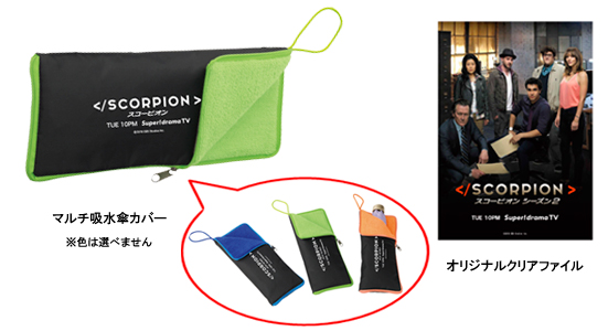 スーパー!ドラマTVでは「SCORPION/スコーピオン シーズン2」独占日本初放送を記念して、7/13(水)~8/31(水)の期間にスカパー!サービスにて「スーパー!ドラマTV」単チャンネルを新規でご契約いただいた方を対象に【SCORPION/スコーピオン】オリジナルマルチ吸水傘カバー&クリアファイルを応募者全員にもれなくプレゼントいたします!