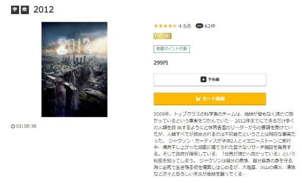 映画「2012」は299円~でレンタル配信してるので、フルで視聴できます。