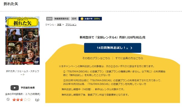 そして、映画「折れた矢」はツタヤディスカスで配信しているので、無料でDVDレンタルが可能です。
