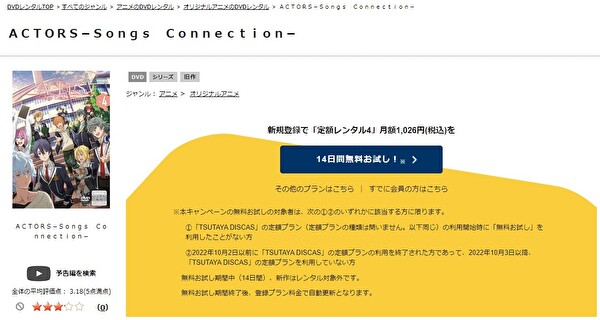 TSUTAYA DISCASは、準新作は8枚まで、話題作・旧作は枚数制限なしでお試し期間中に無料レンタルができ「ACTORS -Songs Connection-」のアニメは、旧作なので無料視聴可能です。