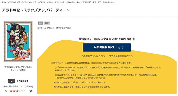 TSUTAYA DISCASは、準新作は8枚まで、話題作・旧作は枚数制限なしでお試し期間中に無料レンタルができ「アラド戦記〜スラップアップパーティー〜」のアニメは、旧作なので無料視聴可能です。