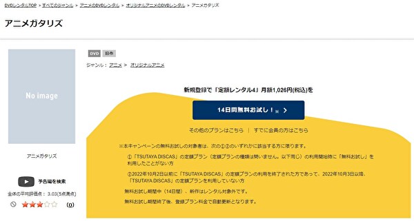 TSUTAYA DISCASは、準新作は8枚まで、話題作・旧作は枚数制限なしでお試し期間中に無料レンタルができ「アニメガタリズ」のアニメは、旧作なので無料視聴可能です。