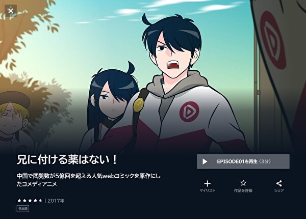 ただ、アニメ「兄に付ける薬はない!-快把我哥帯走-(1期)」の動画は視聴できないので、兄に付ける薬はない!-快把我哥帯走-(1期)を見たい場合はU-NEXTをお試しください。