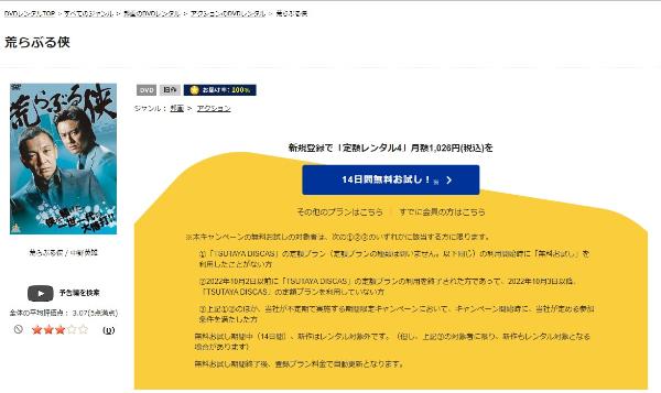 そして、映画「荒らぶる侠」はツタヤディスカスで配信しているので、無料でDVDレンタルが可能です。