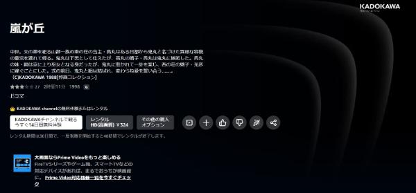 人気の動画配信サービスのAmazonプライムビデオで映画「嵐が丘」の映画がフルで視聴できるか調査しました。