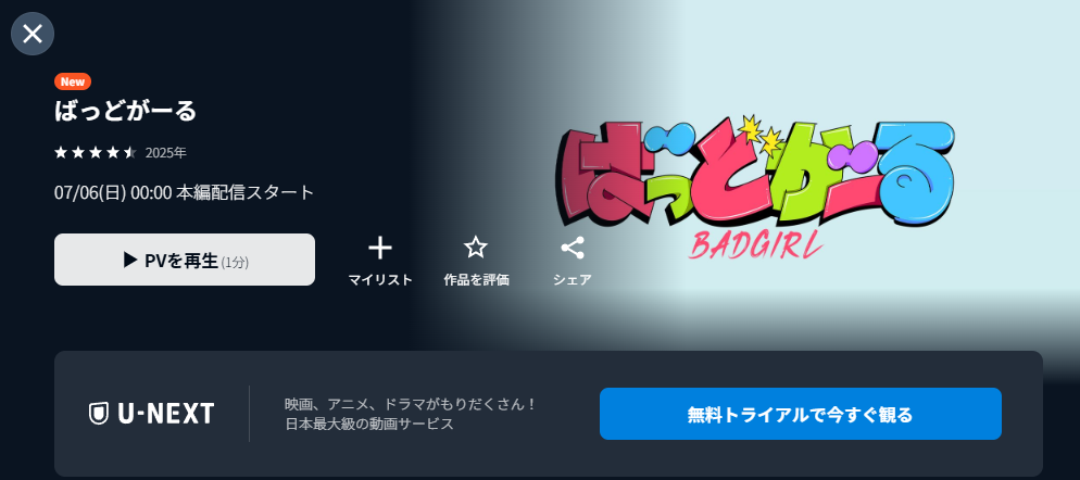 U-NEXTでアニメ「ばっどがーる」の動画を無料トライアルで全話視聴