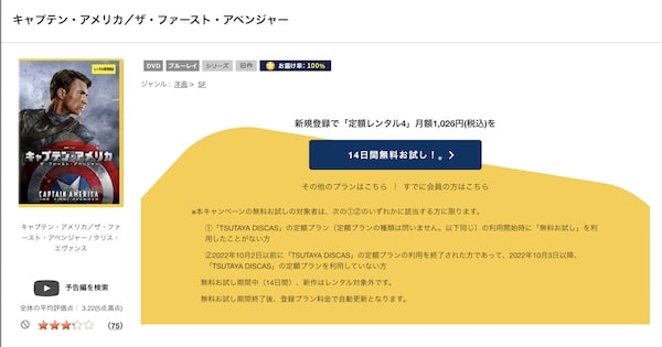 そして、映画「キャプテン・アメリカ/ザ・ファースト・アベンジャー」はツタヤディスカスで配信しているので、無料でDVDレンタルが可能です。