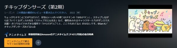 Amazonプライムチャンネルの「アニメタイムズ」は、初回30日間の無料期間(Amazonプライムは30日間)があるので、アニメ「チキップダンサーズ(2期)」は見逃し配信されるので、無料で視聴することができます。