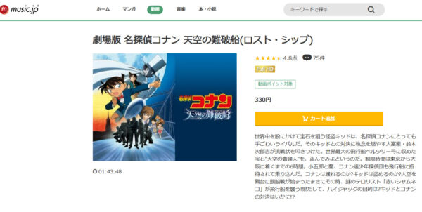 初回登録のみmusic.jpでは1,600Ptが貰えるので「名探偵コナン 天空の難破船」の映画をフルで見ることができます。