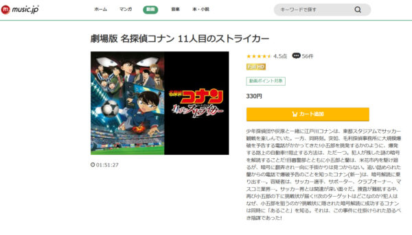初回登録のみmusic.jpでは1,600Ptが貰えるので「名探偵コナン 11人目のストライカー」の映画をフルで見ることができます。