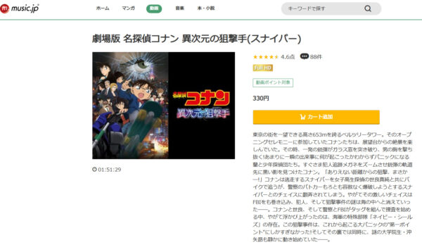 初回登録のみmusic.jpでは1,600Ptが貰えるので「名探偵コナン 異次元の狙撃手」の映画をフルで見ることができます。