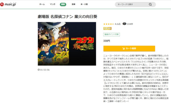 初回登録のみmusic.jpでは1,600Ptが貰えるので「名探偵コナン 業火の向日葵」の映画をフルで見ることができます。
