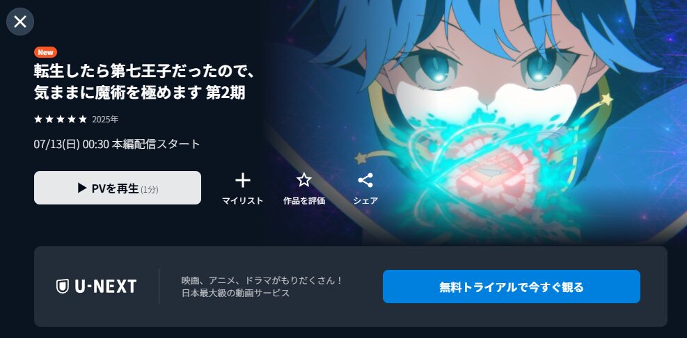 アニメ「転生したら第七王子だったので、気ままに魔術を極めます 第2期」は、U-NEXTで配信中のため、配信開始後無料トライアル中に見放題で全話視聴ができます。