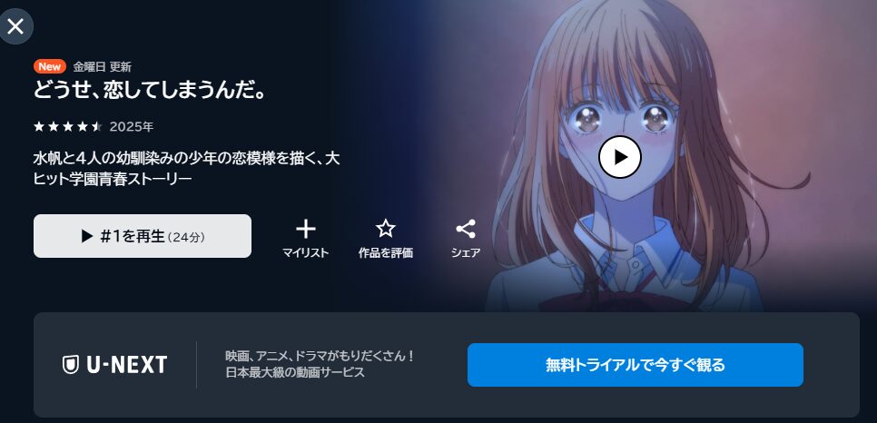 先に結論をお伝えすると、アニメ「どうせ、恋してしまうんだ。」は、『U-NEXT』の動画配信サイトで無料トライアル期間中に全話視聴が可能です。