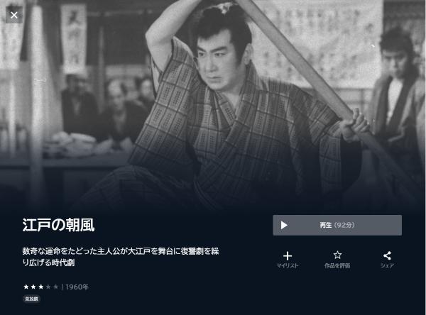 映画「江戸の朝風」が配信されていて、フルで視聴できるおすすめ動画配信サイトは、1つになります。