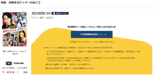 TSUTAYA DISCASのお試し期間中は、準新作・話題作・旧作が8枚まで無料レンタルができ、映画「謎解きはディナーのあとで」は、旧作なので無料視聴可能です。