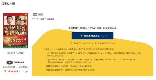 そして、映画「沈まぬ太陽」はツタヤディスカスで配信しているので、無料でDVDレンタルが可能です。