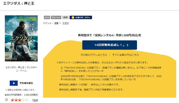 映画「エクソダス:神と王」がテレビで放送されるのを待てない!いち早く視聴したい!という方は、TSUTAYA DISCASで視聴できるのでおすすめです。