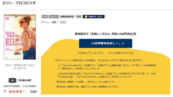 そして、映画「エリン・ブロコビッチ」はツタヤディスカスで配信しているので、無料でDVDレンタルが可能です。