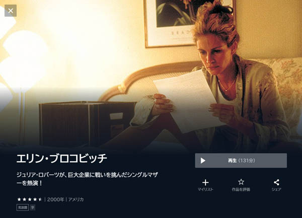 ただ、「エリン・ブロコビッチ」の映画は配信していなく、フルで無料視聴することができません。
