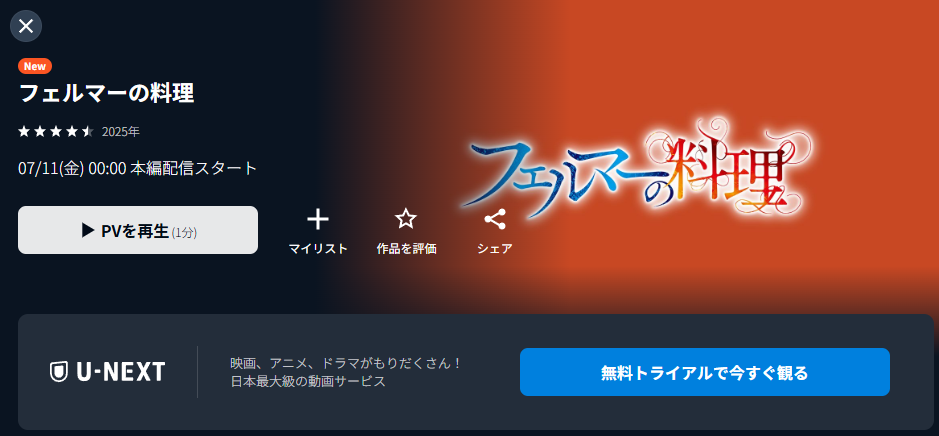U-NEXTでアニメ「フェルマーの料理」の動画を無料トライアルで全話視聴