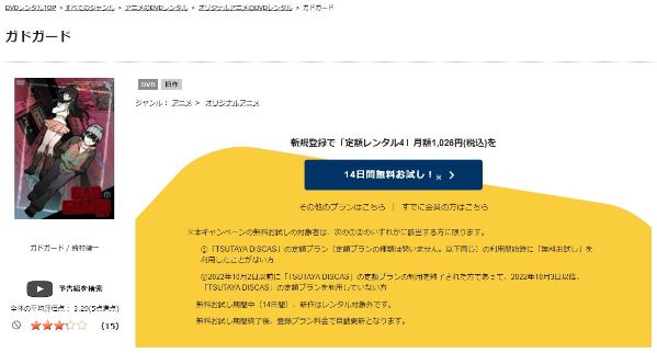 TSUTAYA DISCASは、準新作は8枚まで、話題作・旧作は枚数制限なしでお試し期間中に無料レンタルができ「GAD GUARD」のアニメは、旧作なので無料視聴可能です。