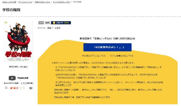 ツタヤディスカスは、準新作・話題作・旧作が8枚までなら、無料お試し期間中にレンタルができるので、「学校の階段」の映画を無料で視聴した後も30日間以内なら他のシリーズ作品や見たかった映画も無料でレンタルすることができますよ。