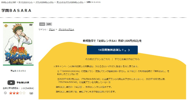 TSUTAYA DISCASは、準新作は8枚まで、話題作・旧作は枚数制限なしでお試し期間中に無料レンタルができ「学園BASARA」のアニメは、旧作なので無料視聴可能です。