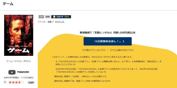 そして、映画「ゲーム」はツタヤディスカスで配信しているので、無料でDVDレンタルが可能です。