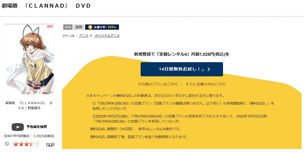 そして、映画「劇場版 CLANNAD -クラナド-」はツタヤディスカスで配信しているので、無料でDVDレンタルが可能です。