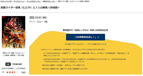 そして、映画「劇場版 仮面ライダー響鬼と7人の戦鬼」はツタヤディスカスで配信しているので、無料でDVDレンタルが可能です。