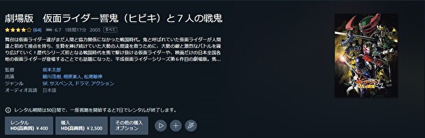 映画「劇場版 仮面ライダー響鬼と7人の戦鬼」はAmazonプライムビデオでもフルで視聴することができます。