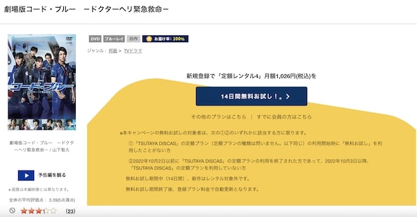 そして、映画「劇場版 コード・ブルー-ドクターヘリ緊急救命-」はツタヤディスカスで配信しているので、無料でDVDレンタルが可能です。