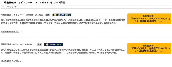 TSUTAYA DISCASは、準新作は8枚まで、話題作・旧作は枚数制限なしでお試し期間中に無料レンタルができ「吟遊黙示録マイネリーベ ヴィーダー」のアニメは、旧作なので無料視聴可能です。