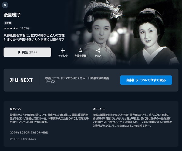 また、映画「祇園囃子」の関連作品の映画もトライアル中にフル視聴が可能です。