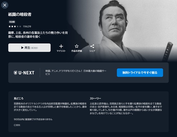 U-NEXTなら無料期間中のお試し期間内であれば、すぐに映画「祇園の暗殺者」の動画をフルに無料視聴することが出来ます。