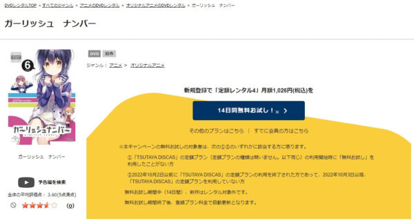TSUTAYA DISCASは、準新作は8枚まで、話題作・旧作は枚数制限なしでお試し期間中に無料レンタルができ「ガーリッシュナンバー」のアニメは、旧作なので無料視聴可能です。