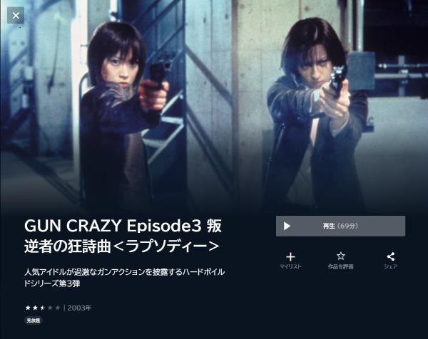 「GUN CRAZY Episode3 叛逆者の狂詩曲<ラプソディー>」の映画は、ツタヤディスカスにて、旧作で配信してるので無料で見ることができますよ。