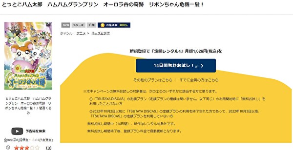 そして、映画「劇場版 とっとこハム太郎 ハムハムグランプリン オーロラ谷の奇跡 リボンちゃん危機一髪!」はツタヤディスカスで配信しているので、無料でDVDレンタルが可能です。