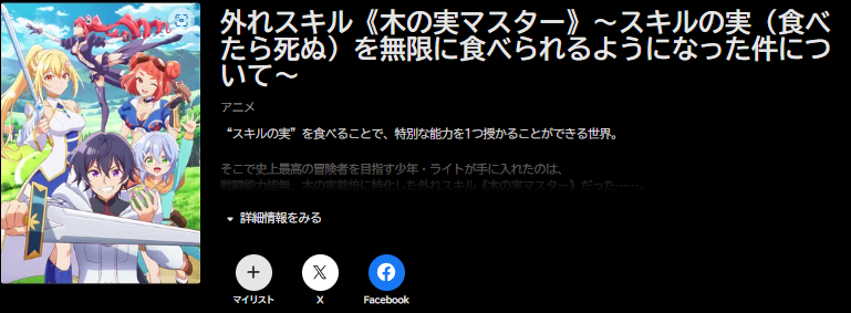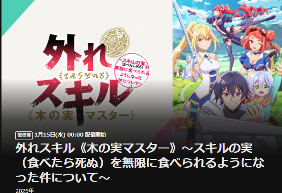 しかし30日間の無料期間があるので、「外れスキル《木の実マスター》~スキルの実(食べたら死ぬ)を無限に食べられるようになった件について~」以外のアニメを全話視聴ができます。