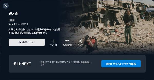 U-NEXTで、映画「光と血」は見放題配信しているのでお試し期間を使えば「光と血」の動画をフルで視聴することができます。