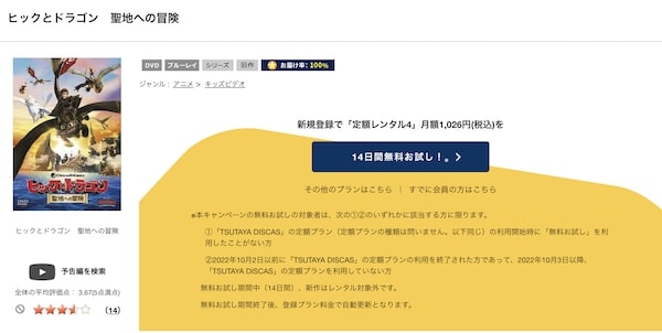 そして、映画「ヒックとドラゴン 聖地への冒険」はツタヤディスカスで配信しているので、無料でDVDレンタルが可能です。