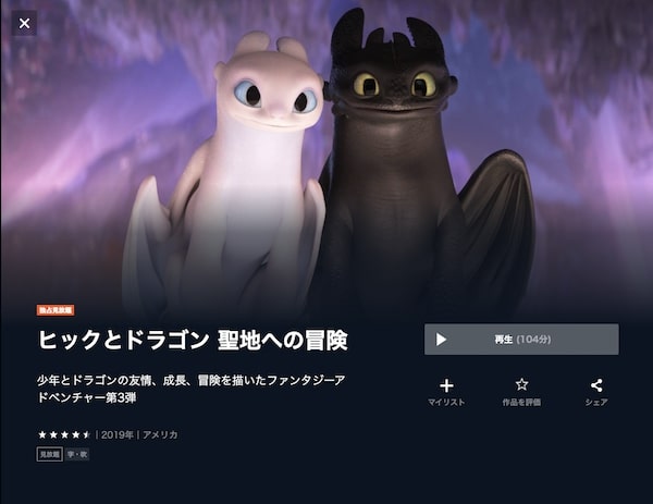 Netflixで、今後「ヒックとドラゴン 聖地への冒険」の配信を待つよりU-NEXTで「ヒックとドラゴン 聖地への冒険」の映画は配信してるのでU-NEXTのお試し期間を使ってフルで無料視聴することをおすすめします。
