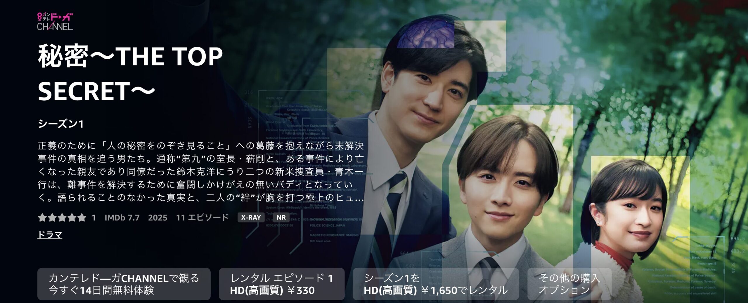 Amazonプライムでドラマ「秘密~THE TOP SECRET~」の配信状況を確認したところ、有料レンタルにて配信されていました。