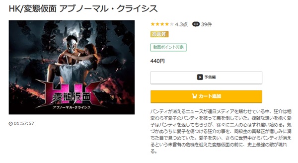 music.jpは、初回登録で1,600Ptが貰えるので「HK 変態仮面 アブノーマル・クライシス」の映画を無料で見ることができます。